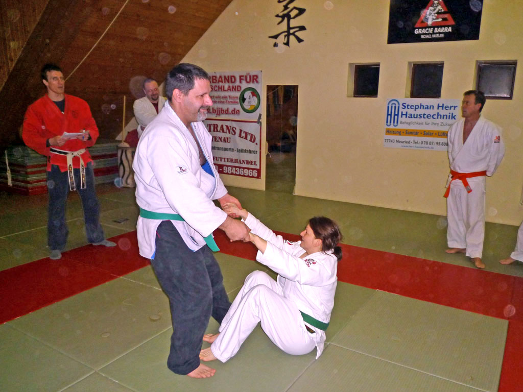 On February 17, 2010, the Neuried Judo and Jiu Jitsu Club (located in Germany) held a belt grading. The nearly 5-hour examination tested 10 candidates in throws, locks, chokes, kicks and punches, and self-defense. They also were required to demonstrate use of and defense against various weapons. As if that was not enough, at the end of the grading a number of those tested were asked to fight blindfolded against several opponents simultaneously.